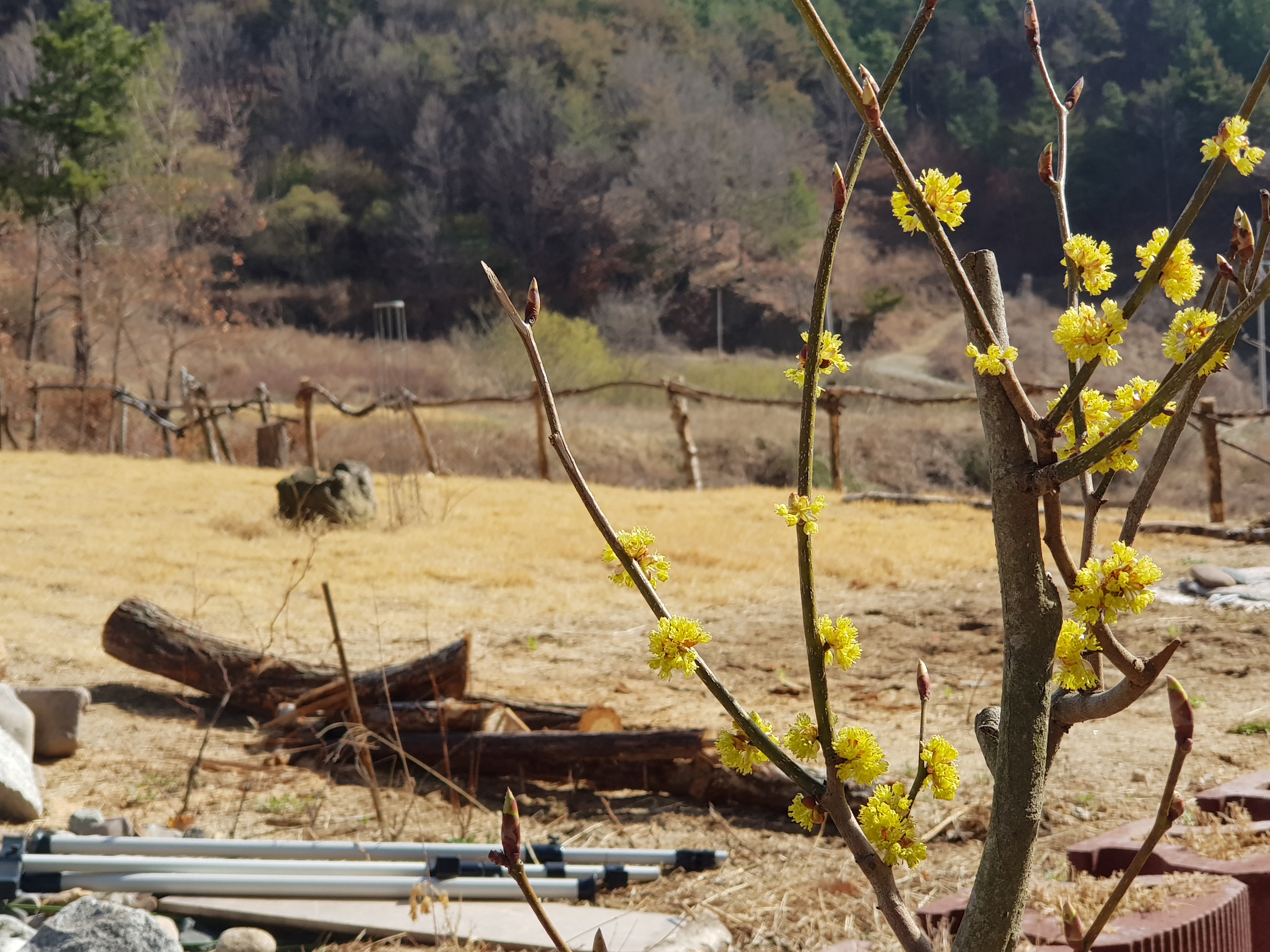 작년에 마당 끝에 옮겨심어둔 생강나무가 남들 모두 움츠리고 있을 때 가장 먼저 꽃을 피워놓고 나도 여기 있습니다 하고 소리치고 있습니다.