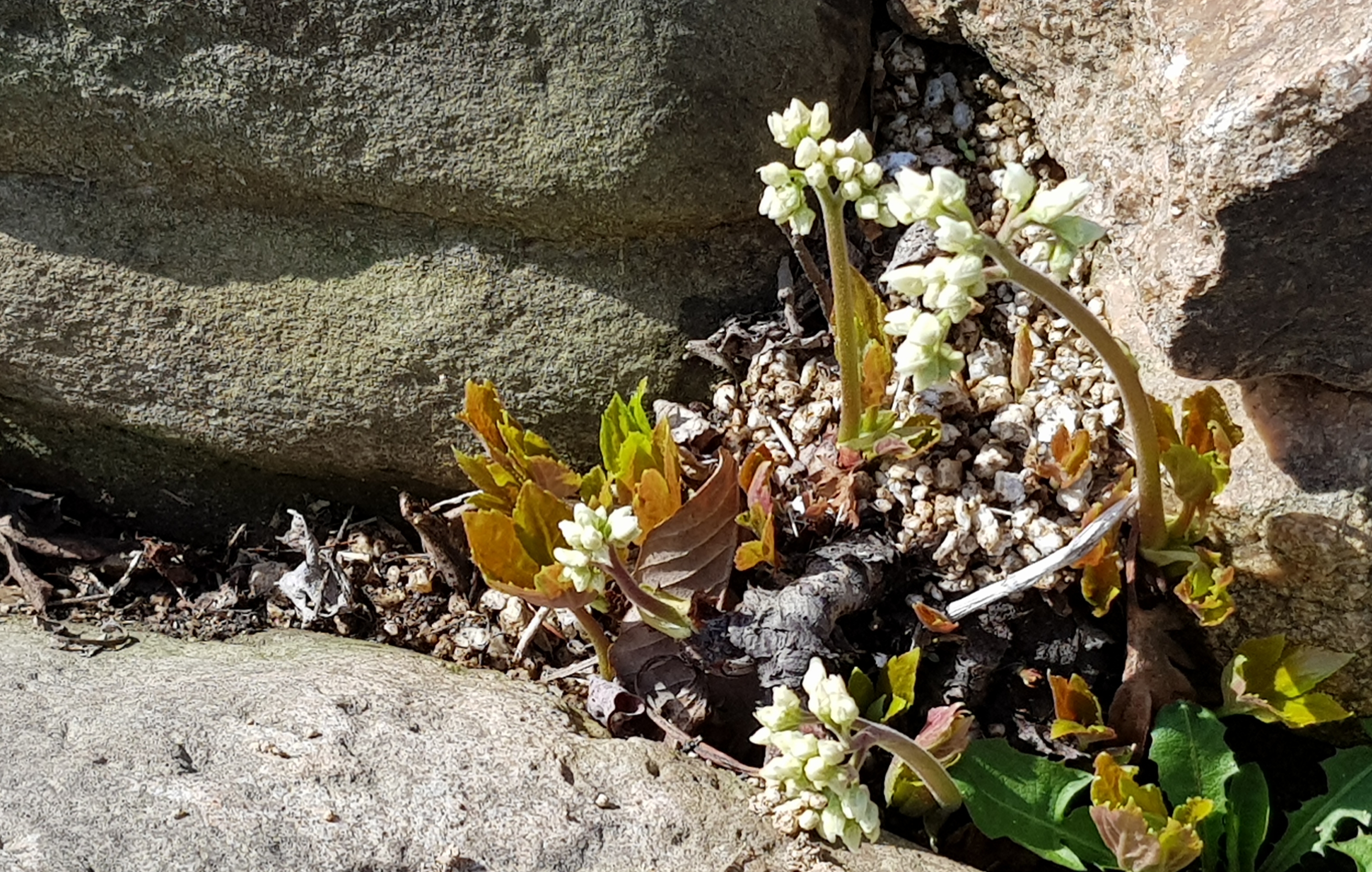 그 말에 질투하듯이 돌단풍이 "새싹보다는 역시 꽃이지요" 하며 꽃대를 부끄러운 듯이 손들고 있습니다.