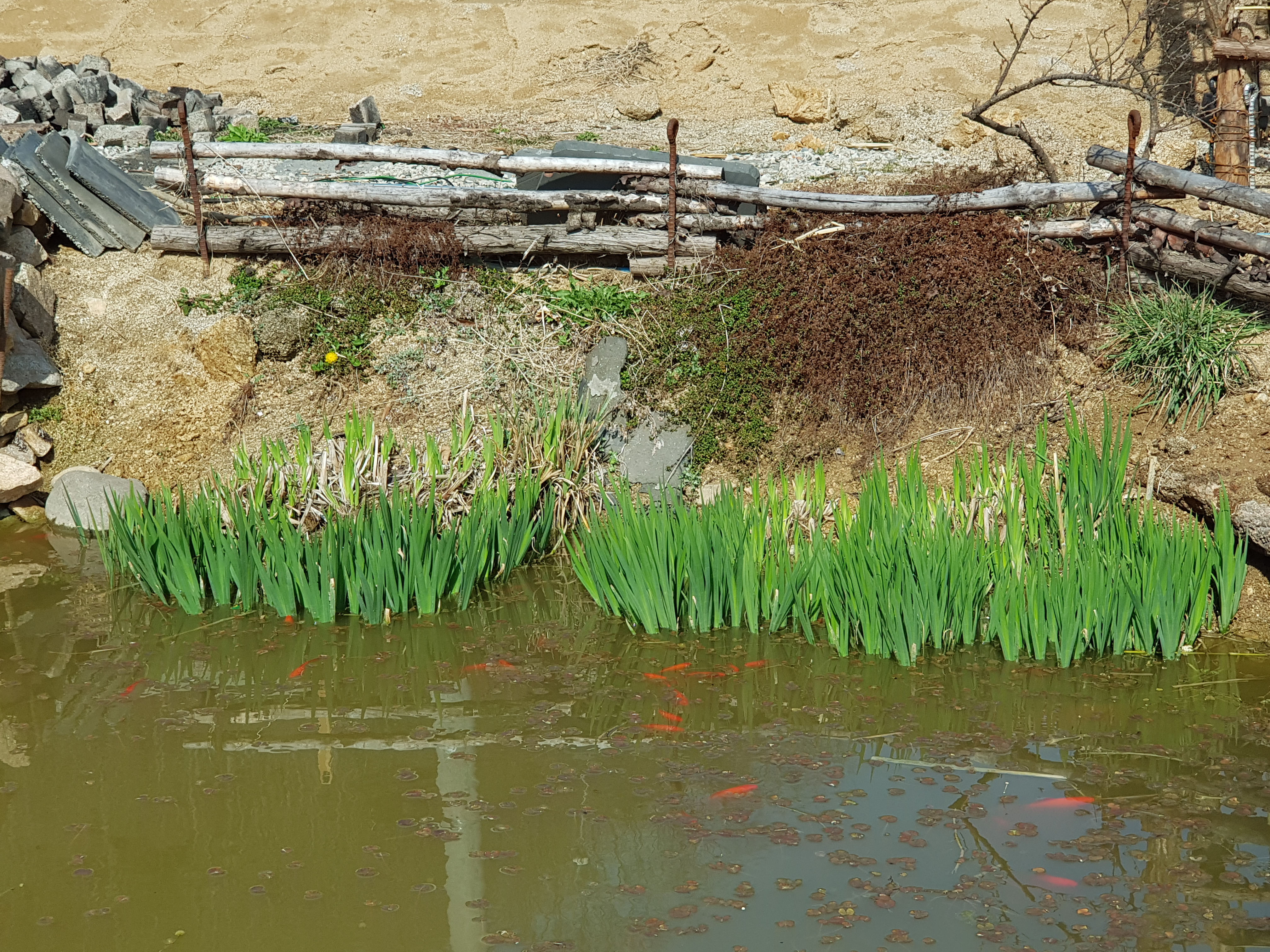 꽃창포, 5월 무렵 노랑꽃이 핀다. 금붕어도 지난 겨울을 잘 견뎌냈다.