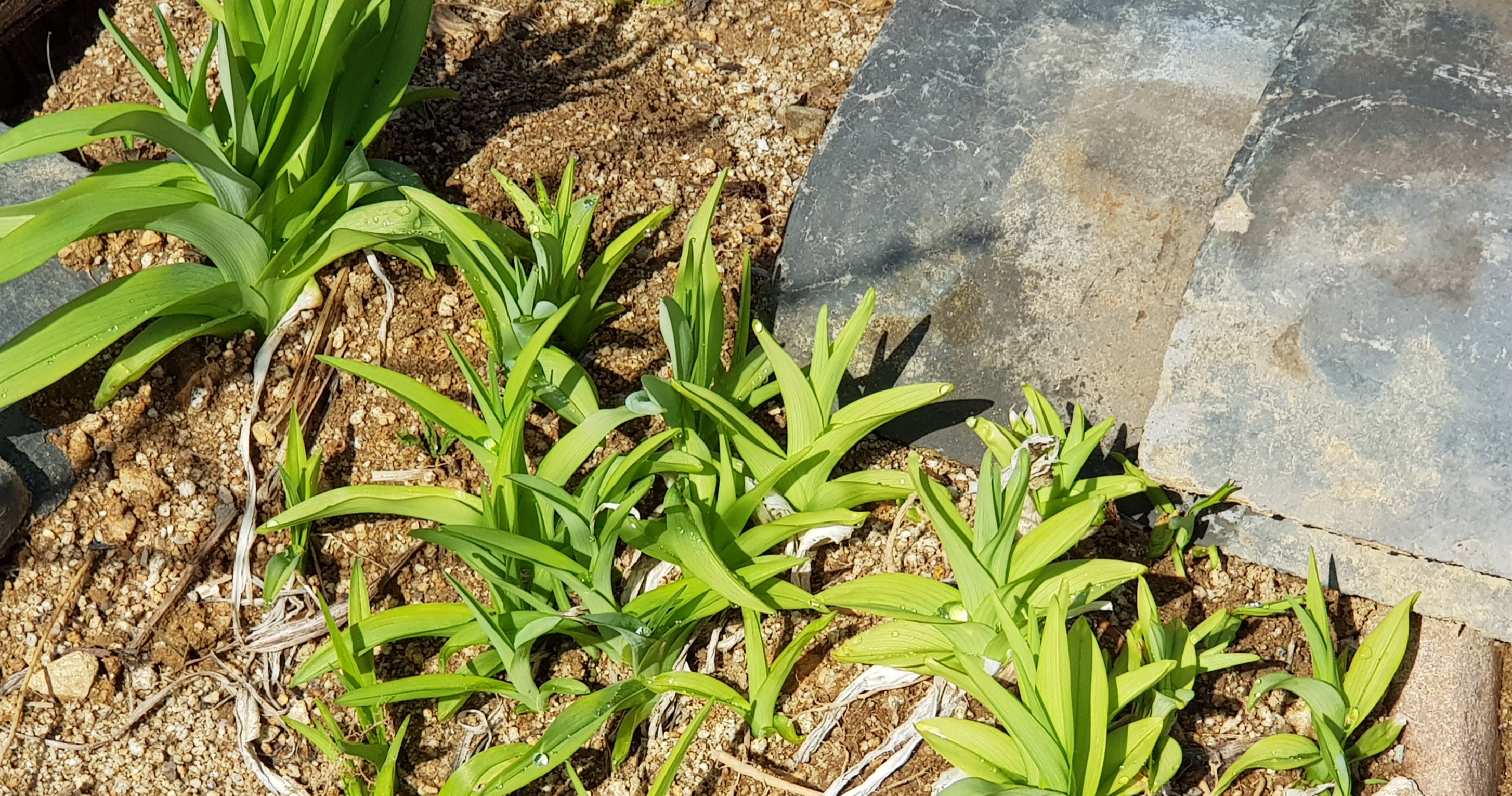 원추리 새싹, 연두빛 색싹이 아름답다. 지금처럼 새싹일 때 데쳐서 봄나물로 먹을수 있다.