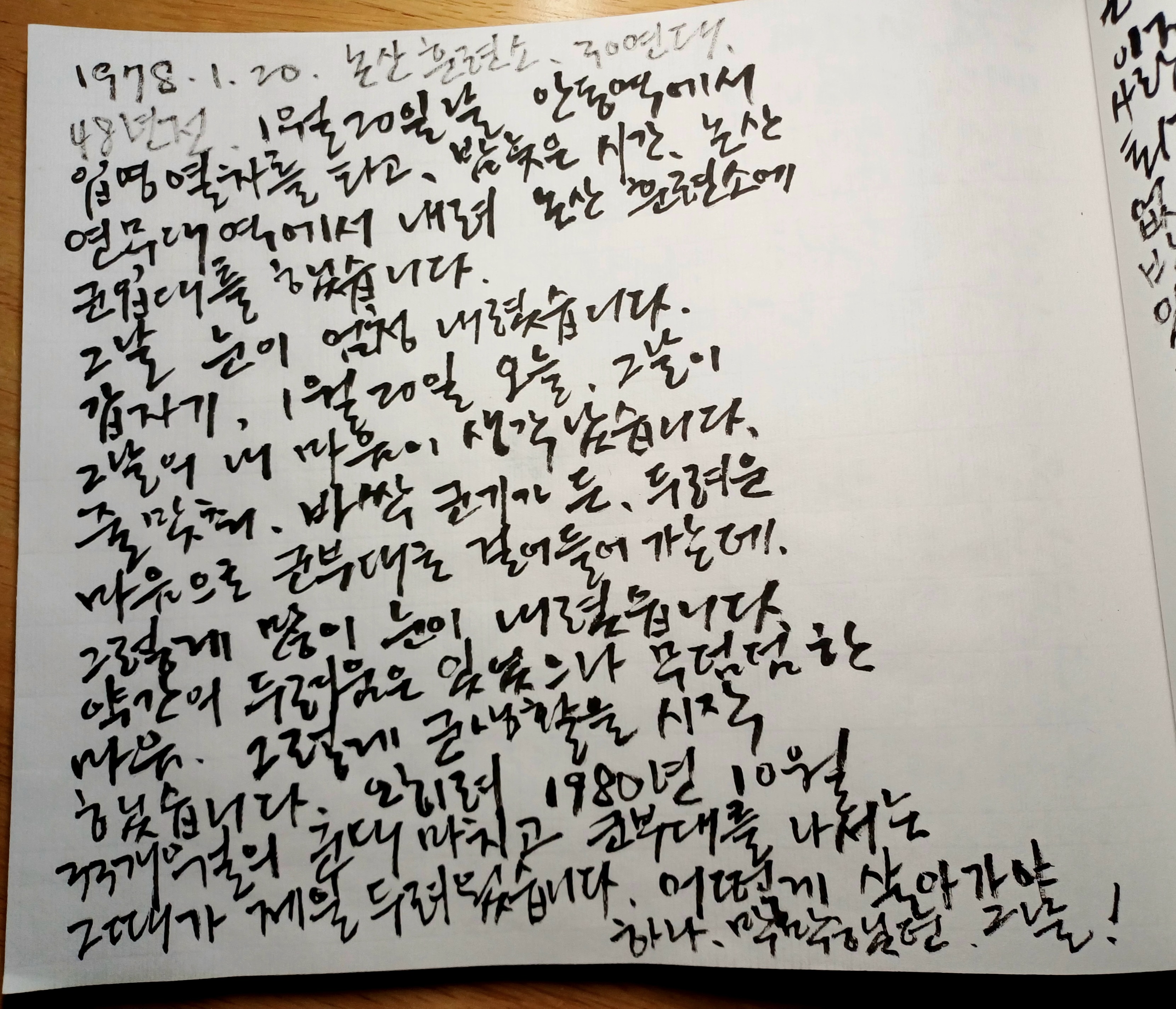 48여 년 전 1월 20일 안동역에서 입영 열차를 타고 밤늦은 시간 논산 연무대역에 내려 논산훈련소 군입대를 했습니다. 그날 엄청 눈이 많이 내렸습니다. 1월 20일 오늘, 갑자기 그날의 내 마음이 생각났습니다. 어두운 밤 바짝 군기가 든 두려운 마음으로 군부대로 줄 맞춰 걸어 들어가는 데, 그렇게 많이 눈이 내렸습니다. 솔직히 약간의 두려운 마음은 있었으나 어쩌면 그 시절 나에게서 도피하듯 미련도 아쉬움도 없이 덤덤한 마음, 그렇게 군 생활을 시작하고 몸 쓰고 머리 쓰는 일 잘하고 잘 견뎠습니다.